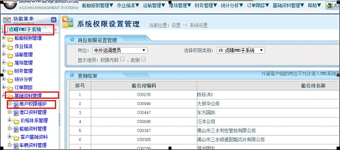 选择所要设置权限的岗位,例如:岗位选择中外运调度员。这时系统会显示当前PMS系统里面所有的船公司信息,勾选这个岗位可以查询的船公司,点击提交就完成了该岗位所可以查询的信息了。