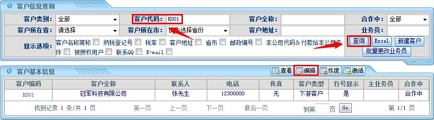输入对应的客户信息,点击查询;例如上图:输入客户代码K001,也可以按客户名称定位查询。
