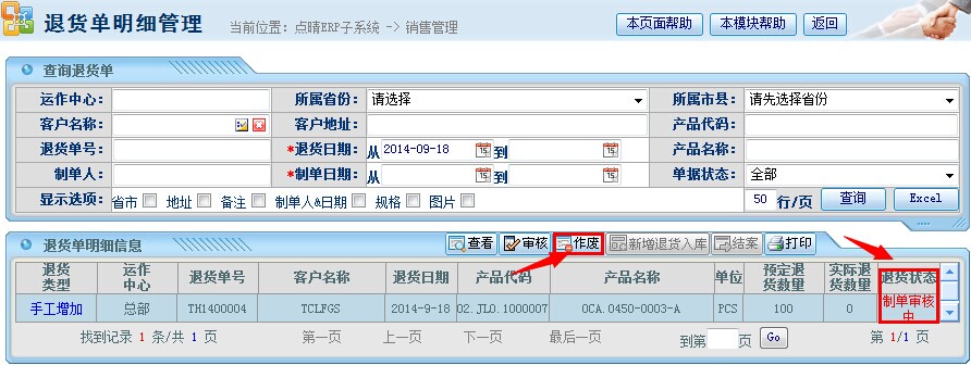 销售退货单作废操作:销售管理——销售退货单管理——退货单明细管理;进入页面如下图操作: