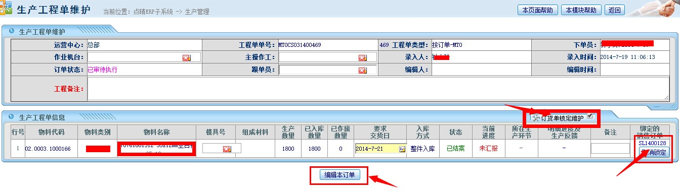 一张销售单上面存在多个物料,其中一部分按正常的排产入库发货结案,还剩下部分物料,由于客观的原因不再进行排产发货了。那么这张单如何进行结案呢? 以下图这种情况为例: 上图就是典型的例子,直接想结案,发现结案按钮是灰色的。 结案销售单,必须保证销售单所对应的所有生产工单都需要解锁,且没有正在进行的送货单。 解决方法: 1、找到这张单对应的生产工单,如下图所示; 2、点击查看按钮,对工单进行解锁操作; 3、返回到需要结案的销售单,这是结案按钮正常亮起,可以进行结案操作。 点晴模切ERP更多信息:https://moqie.clicksun.cn,联系电话:4001861886 该文章在 2016/2/15 10:07:35 编辑过 |