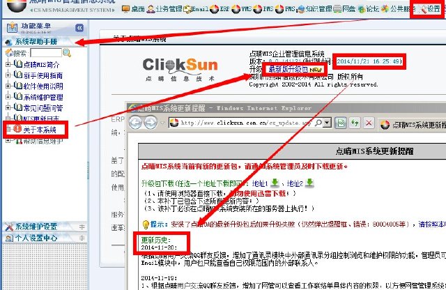 ”,然后将这个页面上的“升级时间”与点晴公司发布的升级包中“更新历史:”最后更新时间作比较,如果你的升级时间在点晴升级包之前,那就说明需要升级,否则无须升级:![]() 查看上面的位置,升级时间在升级包更新历史之后,则说明已更新到最新版了。