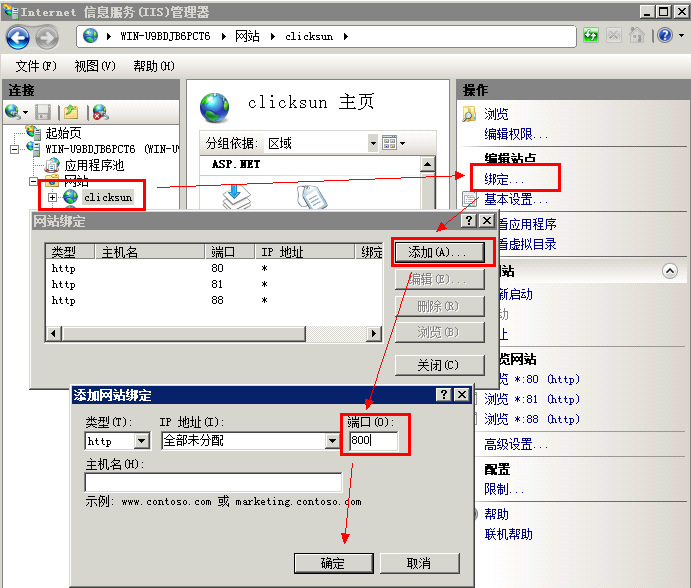 如果是IIS6以上版本,直接打开IIS管理器,在点晴OA所在的网址clicksun上更改或绑定其他端口就行了: