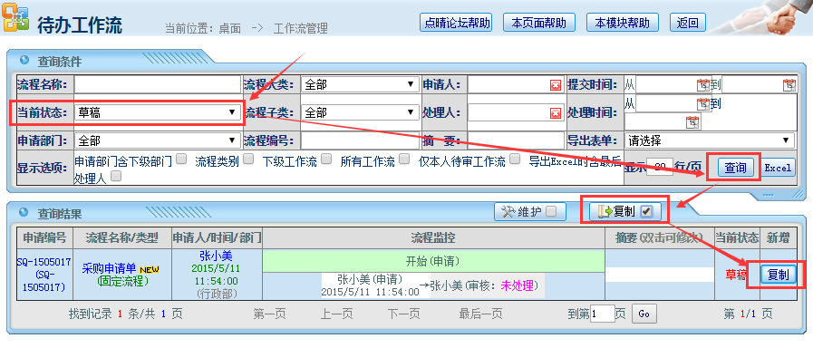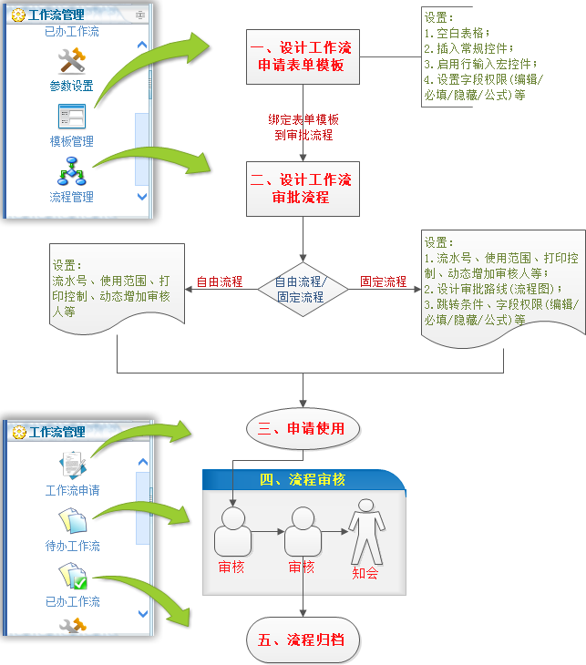 1、工作流就是多人协同完成一项工作,也就是多人按顺序依次填写一张表单, 或者填写会签意见。 2、工作流中的表单和流程一般都是由公司OA管理员设计好的。 3、点晴OA办公管理系统中的表单模板格式可以通过各种网页制作工具(Dream Weaver、Front Page、SharePoint等)制作完成后导入系统,也可以使用 word设计好之后复制粘贴到到表单设计页面即可。 4、模板数据支持自定义SQL语句动态调用点晴OA其他模块数据或其他管理系统数据(需使用SQL Server),可以自动填充到工作流申请表单中(例如:费用报销单需要调用出差申请单、员工请假需要调用已请假天数、调用金蝶K3单据等),调用的SQL语句中支持插入当前用户身份识别的相关宏变量:用户名、所在部门、岗位、职级等; 5、每个流程对应一个表单,不同的流程可以共用一个表单。 6、流程分为固定流程和自由流程两种,固定流程由固定步骤组成,用户事先需定义好,自由流程无需定义流程步骤,由申请人指定审核路线。 7、固定流程每个审核节点都可以单独权限控制,审核时可以设定编辑、必填、隐藏指定字段。 8、工作流填写申请时可暂存为草稿,以后可以再继续申请该表单。 9、执行中的工作和已完成的工作都可以通过工作流管理——待办工作流(已办工作流)进行査询,但首先您需要有工作査询的菜单权限和对流程的査询权限。 点晴OA工作流模块使用方法![]() 点晴OA工作流模块视频操作指引正式进行以下操作前,务必先仔细浏览点晴OA工作流视频操作指引:点晴MIS系统工作流制作视频教程 该文章在 2015/12/25 15:39:44 编辑过