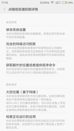 2、安装完APP之后,请去手机设置》应用管理,查看APP是否已经获得下面权限,如果没有取得下面权限,请赋予APP一下权限:修改系统设置、访问网络、访问位置等权限