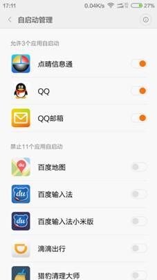 5.1、打开设置——点击权限管理 5.2、进入页面后点击“自动启动管理”5.3、进入页面,选择“点晴信息通”,设置启动,如下图:
