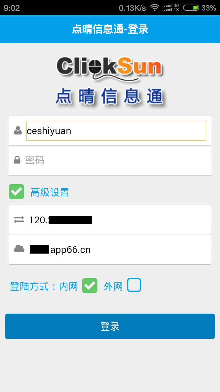 4、登录页设置说明,用户名及密码为WEB版登陆的用户名及密码,服务器地址及内外网登陆请按照下图填写,由于服务器在阿里云,所以勾选内网登陆即可。