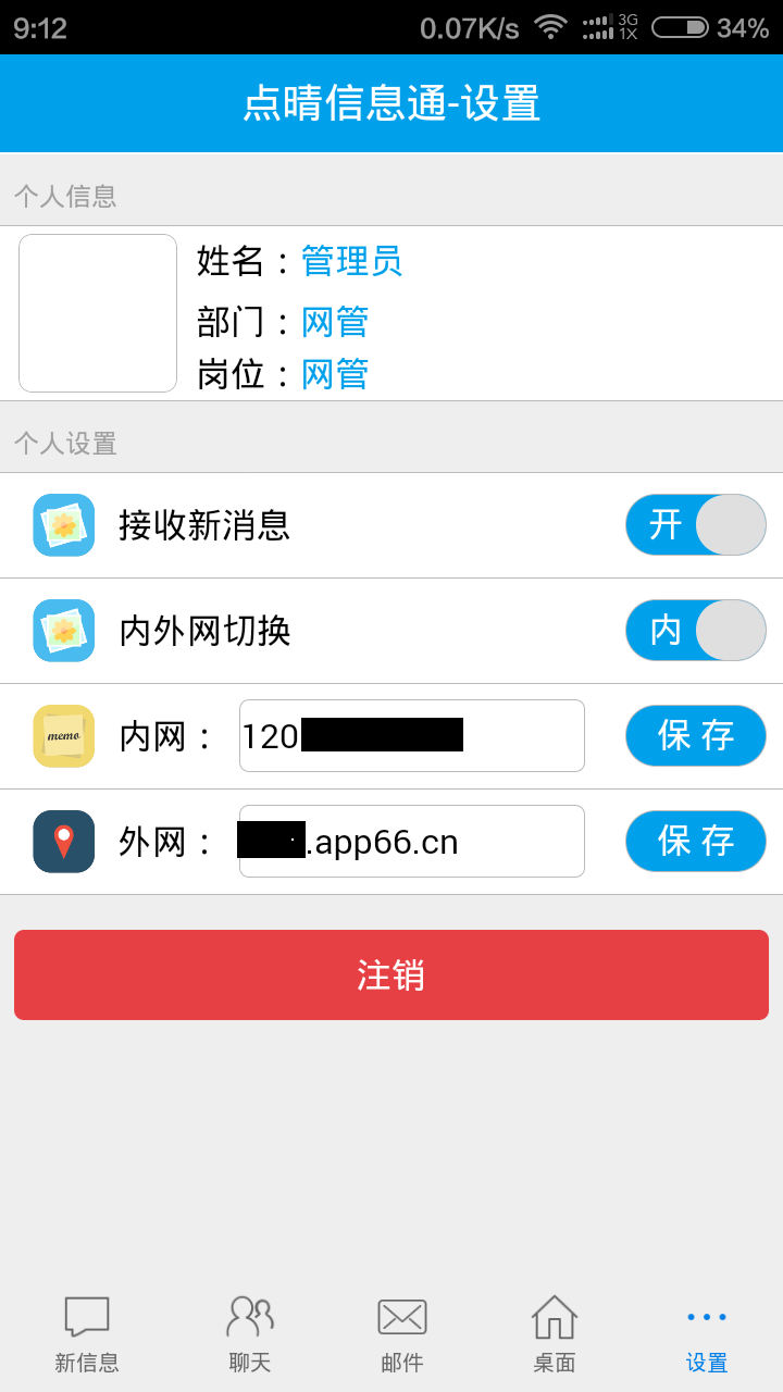 5、登陆成功后,进入app的设置页面,开启接收新消息。如下图所示: