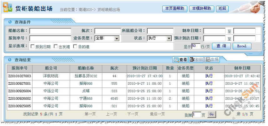 系统自动列出状态为“执行”的货柜装般报到单;用户可根据需求设置查询条件,点击【查询】查找出符合查询条件的单据。点击【Excel】可把查询结果导到Excel文件中。