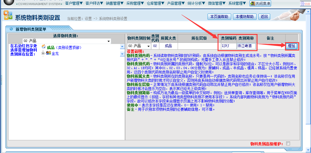 操作:产品管理——产品类别设置——选择品种——录入类别编码与类别简称——点击“增加”按钮;如下图所示: