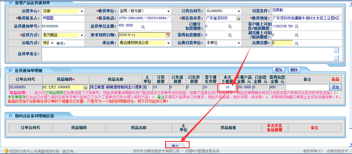操作步骤:销售管理——销售订单查询——选择对应的销售订单——点击“发货通知单按钮”如下图所示: