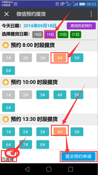 3、确认好预约日期(默认选择次日)、预约时间段、号码,点击“提交预约申请”按钮:
