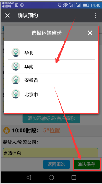 2点击“提交预约申请”按钮后进入后:选择对应的运输省份,勾选需要提货的发运标识(不清楚需咨询委托提货的客户,一定不能选错),点击“确认保存按钮”: