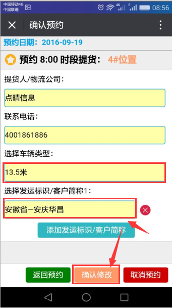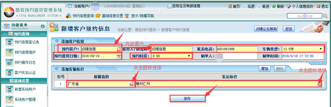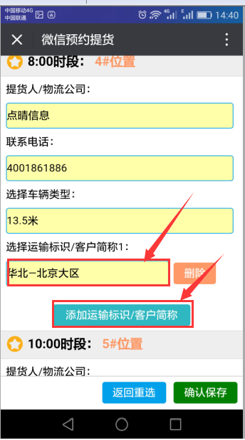 1、选择预约客户(提货人、联系电话、车辆类型自动关联显示)