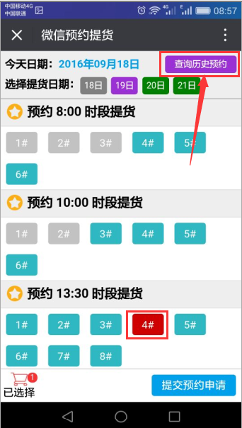 2进入微信公众号——预约提货——点击页面右上方的“查看历史预约”: