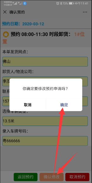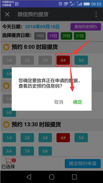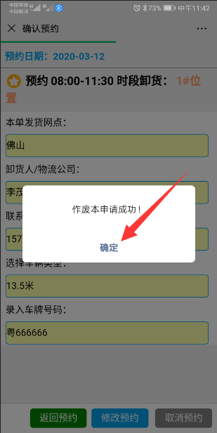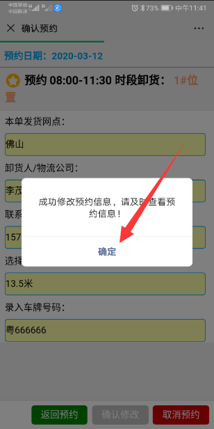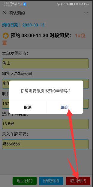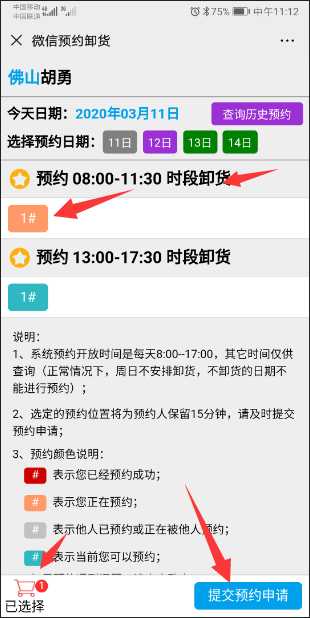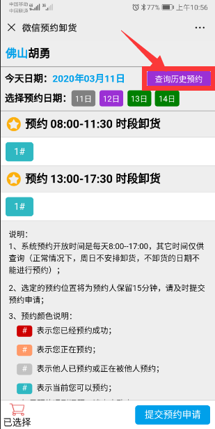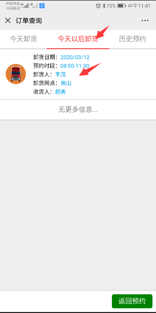 1进入微信公众号——服务中心——提货卸货预约——选择卸货预约——选择对应网点——选择对应收货人——点击历史预约记录——选择对应的预约明细: