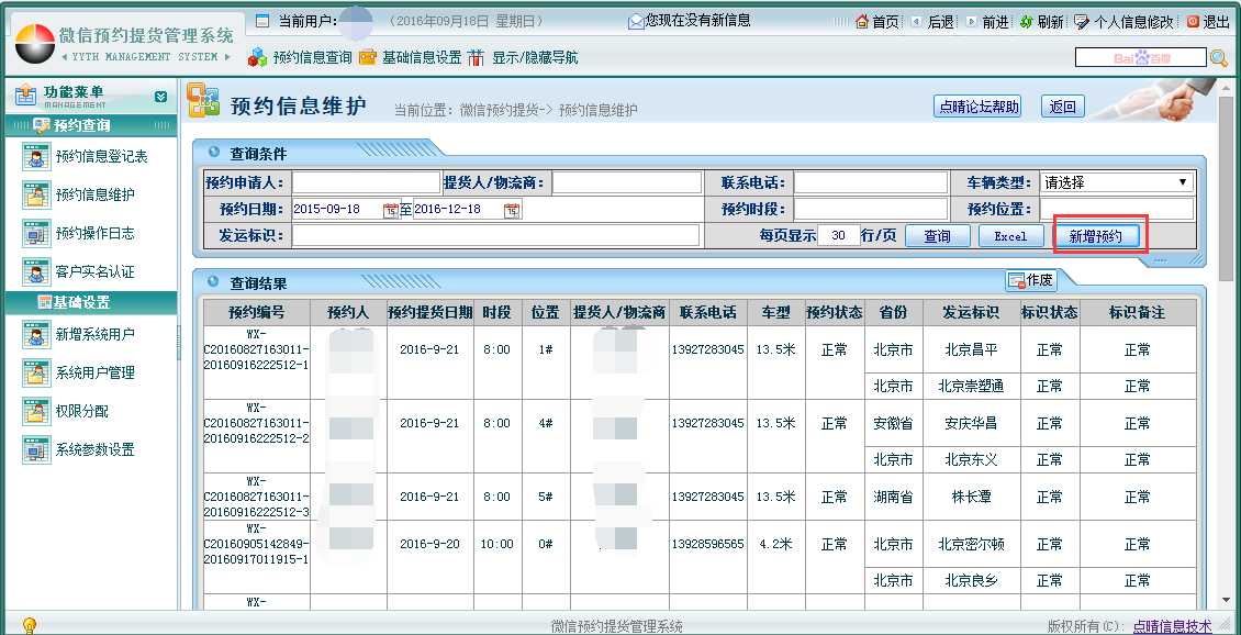 操作步骤:预约信息查询——预约查询——点击“新增预约”按钮如下图所示:
