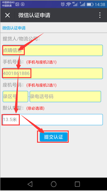 2进入认证申请(实名制):录入公司或提货人、手机号码、车型信息,点击提交认证按钮完成: