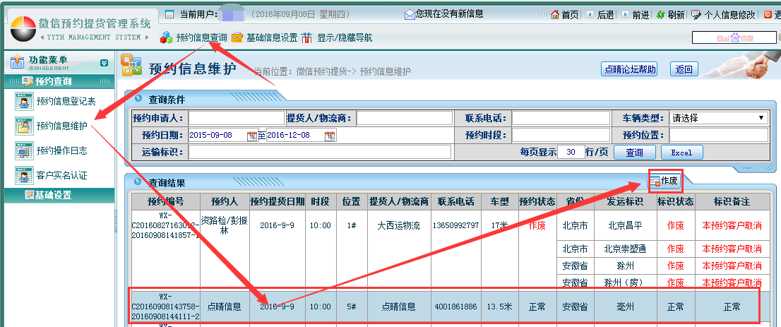该界面可进行预约申请的Excel导出与预约信息作废操作。