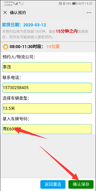 4、点击按钮后进入确认页面,录入对应的车牌号再点击“确认保存”按钮: