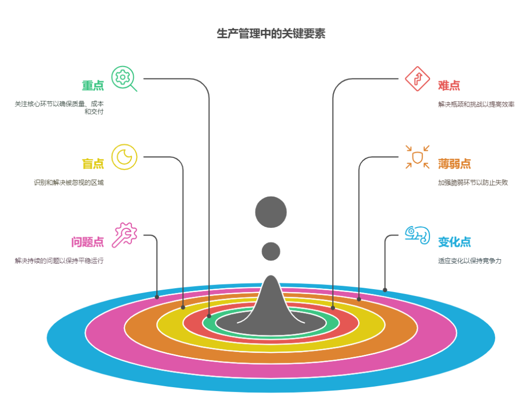 生产管理是生产制造企业运营的核心环节,直接影响着企业的竞争力和可持续发展力。从原材料的采购,到产品的最终交付,每一个步骤都需要精心规划与严格把控。在生产管理的复杂棋局中,管理者如同运筹帷幄的将军,需精准把控关键“棋子”,才能确保生产流程顺畅、高效。其中,“重点、难点、盲点、薄弱点、问题点、变化点”这六点,是生产管理中不...