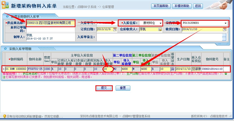 操作步骤:仓库管理——物料入库管理——采购入库管理——新增采购入库单;进入页面如下图操作:填写(选)资料步骤:1、输入信息查询供应商名称