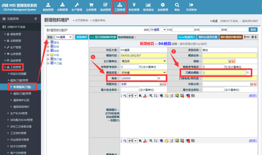 操作步骤:工程管理-模具(刀模)管理-模具(刀模)管理 进入界面后,选择对应明细,点击维护按钮 对应录入相关信息