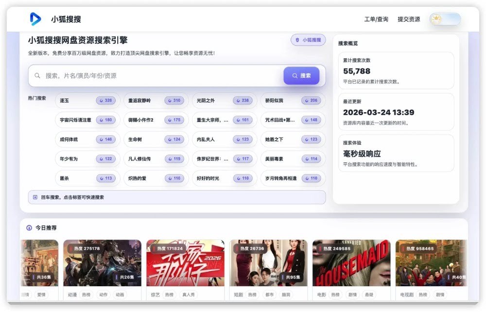 小狐搜搜:一个免费的网盘资源搜索引擎,快速查找影视、剧集、综艺等网盘资源网址:https://uuyue.top/面向需要查找影视、剧集、综艺等网盘资源的用户,解决用户难以找到优质网盘资源的痛点,提供百万级网盘资源的搜索服务,核心价值是免费、快速地为用户提供便捷的网盘资源检索渠道。