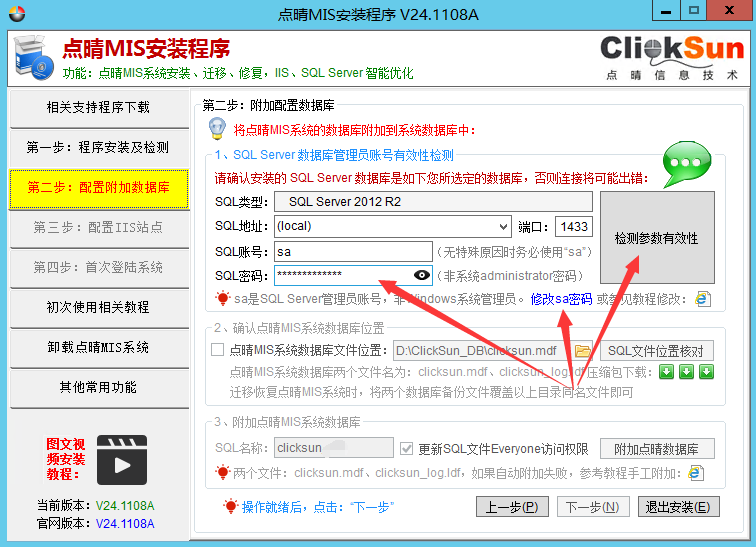 重新安装配置一下点晴MIS系统即可,安装教程和安装程序下载地址:http://install.oa22.cn。重新安装时,不需要卸载当前点晴MIS系统,直接重新安装配置即可,安装过程中,在以下界面输入新的SQLServer登录账号和密码,安装程序就会自动将所有需要用到数据库登录...
